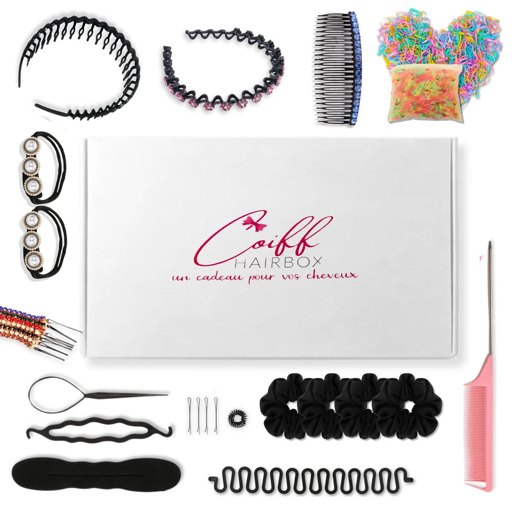 Une box avec une sélection d'accessoires innovants pour vous aider à réaliser facilement des tresses et d'autres styles créatifs.